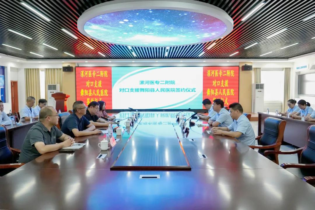 7月1日,在舞陽縣人民醫院會議室舉行漯河醫專二附院對口支援舞陽縣人民醫院協議書簽訂儀式。漯河醫專二附院黨委書記柴運洪、副院長鄭建新、醫務科主任徐向峰,舞陽縣衛健委副主任楊云峰、婦幼股股長張艷麗,舞陽縣人民醫院黨委委員、副院長魏廷舉、醫務科科長馬瓊,以及兩院專家代表共同出席。