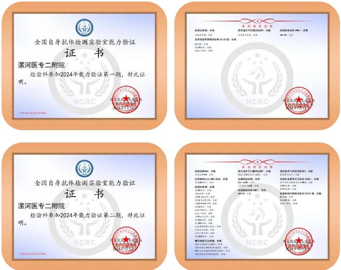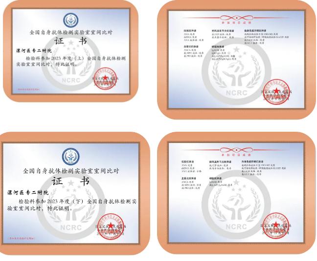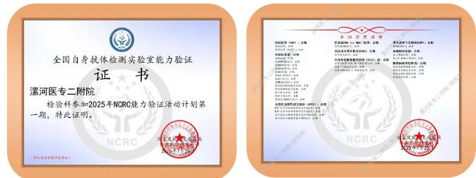 近日,漯河醫專二附院(漯河市骨科醫院、漯河市立醫院)檢驗科自身免疫實驗室在“國家皮膚與免疫疾病臨床醫學研究中心(NCRC)”組織的、北京協和醫院牽頭的全國自身抗體檢測實驗室能力驗證中,再次憑借卓越的檢測能力和穩定的技術水平,斬獲合格證書。這已經是自2023年以來,連續3年獲此殊榮,充分說明了醫院自身免疫實驗室的檢測結果與全國251家實驗室數據高度一致,達到國家級標準化水平,為臨床診斷提供了堅實可靠的依據。