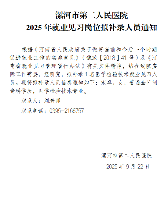 【公示】漯河市第二人民醫院2025年就業見習崗位擬補錄人員通知