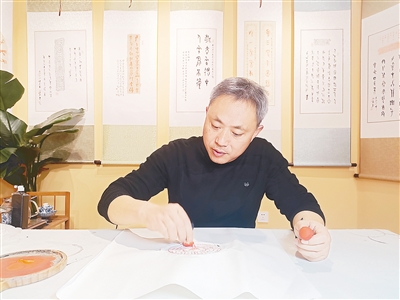 1月17日,在李凱歌的工作室,記者看到很多文獻類、古器類、碑刻等拓片。在一張方桌前,他熟練地將宣紙輕輕地覆蓋在一塊刻有龍紋的漢磚上,先用水把紙打濕、用棕刷掃壓、排出空氣,再通過捶打緊固,使紙張緊貼石刻凹紋,然后用蘸墨或蘸朱砂的拓包繼續拍打……經過一系列操作后,磚上的龍就浮現在宣紙上。