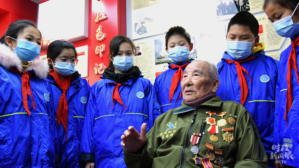 △2021年1月23日,江蘇省軍區(qū)連云港離職干部休養(yǎng)所,小學(xué)生聆聽93歲老軍人孟昭宇講述親身經(jīng)歷的戰(zhàn)斗故事。
