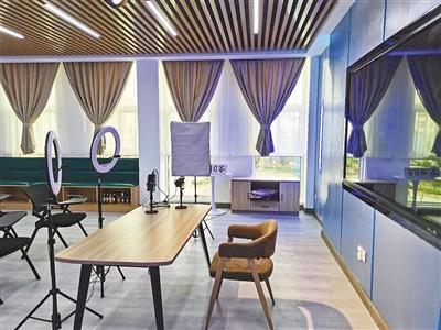在網紅直播間,直播支架、擴音器、電子顯示屏等設備齊全(如圖)。“需要帶貨直播、有紅色文化傳播需求的,可以來這里免費使用場地和設備。”該負責人說。