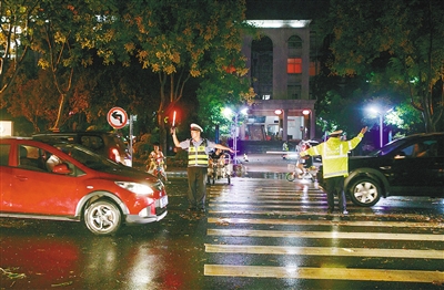 強降雨導致交通擁堵,交警也延長了執勤時間。圖為18日晚上9點,洪河路與嵩山路交叉口,交警在路上疏導交通。
