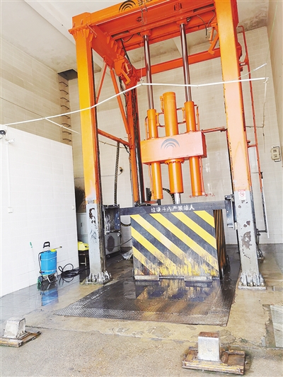 在黃崗村垃圾中轉站,一臺壓縮機正在作業。記者發現,每來一輛垃圾運輸車,就會有專人及時處理。只見環衛工人一邊用清水清洗著地面,一邊用鏟子將遺留在地面的垃圾清理干凈,始終保持中轉站內部整潔。