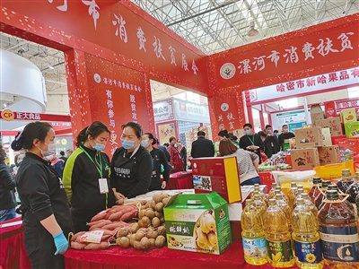“全面小康,一個不落”“脫貧攻堅大舞臺,有你參與更精彩”“以購代捐解民憂,消費扶貧助發展”……在漯河市消費扶貧展會上,紅色背景墻上處處都是與“扶貧”相關的宣傳標語。香菇、鴨蛋、紅薯等富有特色的農產品令采購商們收獲滿滿。