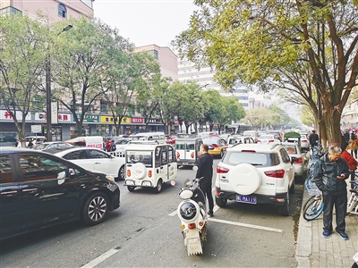 下午3時40分,記者在前往漯河育才學校的路上發現泰山路從遼河路口起往北出現大擁堵,機動車道兩側停滿了接學生放學的車輛,各種三輪車和自行車則占據了非機動車道。尤其是學校門前的機動車道兩側都只剩下一個車道通行,加上多路公交車通過,整條道路擁堵不堪。在學校大門前,記者未發現交警在現場指揮,未見管理道路交通的志愿者,只見多名身著志愿者服裝的家長志愿者和教師志愿者在維持學生隊伍秩序。