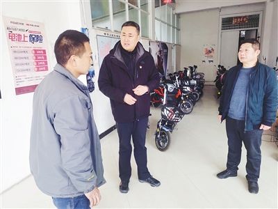 王彥偉(左二)在向臨街商戶宣傳“門前三包”政策。