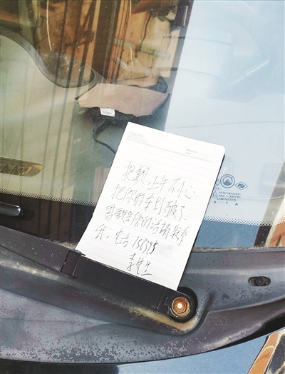 當天中午,趙先生準備開車去親戚家串門。開車門時,趙先生發現擋風玻璃上有一張紙條,上面寫著:抱歉,上午不小心把你的車劃傷了,需要賠償的話請聯系我。