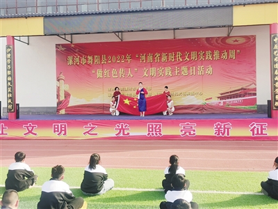(記者 姚曉曉)“久有凌云志,重上井岡山。千里來尋故地,舊貌變新顏。到處鶯歌燕舞,更有潺潺流水,高路入云端……”3月2日下午,伴隨著學生們鏗鏘有力的朗誦聲,我市“做紅色傳人”文明實踐主題日宣傳活動在舞陽縣春雨國文學校拉開序幕(如圖)。