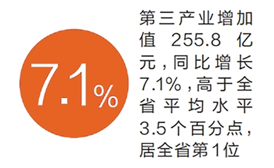 分產業看,三次產業增加值增速全面領先。第一產業增加值18.4億元,同比增長2.9%,高于全省平均水平0.3個百分點,居全省第四位;第二產業增加值189.2億元,同比增長11.7%,高于全省平均水平5個百分點,居全省第二位;第三產業增加值255.8億元,同比增長7.1%,高于全省平均水平3.5個百分點,居全省第一位。