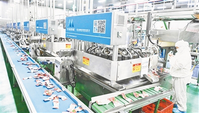7月23日,衛龍美味三期園區智能生產線全速運轉。經過原料投放、溶脹成型、冷凍、附味、殺菌等環節后,一批批魔芋爽新品完成最后包裝工序,“走下”生產線,“奔”向各地市場。