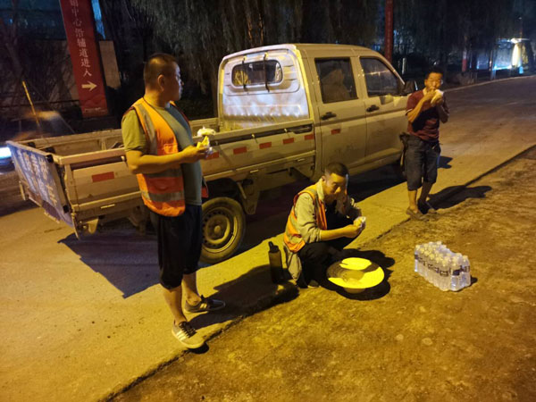 近日,源匯區公路養護中心養護人員加班加點奮戰在五一南路、交通南路金江路施工一線,動用二百余人次、上百輛車次,頂烈日、趕工期,加班加點吃在一線、拼在一線,為了節省時間,晚飯就蹲在路邊囫圇吞棗的把飯吃了。“最難受的是夏天道路鋪油層,溫度能達到一百七八十度,隔著二十幾米遠也像架在火上烤。”養護工笑著說。連日來的高溫,早已將他們的臉曬得黝黑,身上的衣服已經被汗水浸濕,濕了又干,干了又濕。他們冒酷暑戰高溫放棄休息時間,開展道路維修工作,為了給市民提供一個暢潔的通行環境。