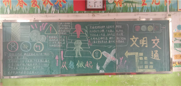 各班通過學生自主搜集材料,自主設計創作“安全伴我行”黑板報,再一次向每個中學生敲響安全警鐘,徹底遠離交通危險!各級各班將交通安全知識生動形象或寫或畫在黑板上。其內容生動有趣,色彩紛呈,精巧別致,醒目大方。體現了知識性、趣味性與實用性的統一。有效地加強了學生交通安全防范意識,使學生掌握了必備的交通安全知識,時刻牢記自覺遵守交通法規。