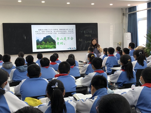 六年級的李敏杰老師,給我們帶來了《青山不老》。李老師課堂節奏緊湊,注重知識的連貫性,熟練的運用多媒體教學,渲染氛圍,吸引學生注意力調動學生積極性!學生們預習認真,整節課自學氛圍很濃厚。