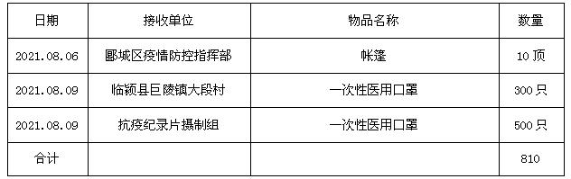 截止到8月16日20時,漯河市新冠肺炎疫情防控指揮部累計收到社會捐贈款物價值13,661,498.4元,其中捐贈物資價值5,575,623.88元,現將接受社會捐贈款物支出分配情況公示如下: