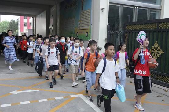 18點15分,錯峰放學的三、四年級學生按照南北兩隊分別從學校南北兩個大門走出,行至各自的接送點。18點30分,最后放學的高年級學生也分成兩隊走出校門,18點40分,全校學生全部有序離校,沒有擁堵現象發生。