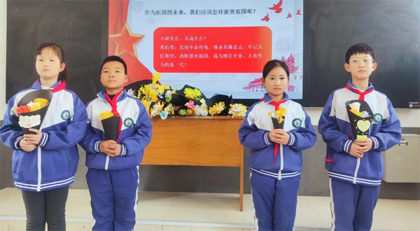 班主任通過講述革命烈士先進事跡,對學生進行思想道德教育和弘揚中國傳統革命精神教育,讓學生在革命精神的激勵下,發揚革命傳統,繼承英烈意志,牢記人民期望,成為繼往開來,大有作為的新一代!同學們也為英雄獻上了自己手工制作的花束,表達著對革命英烈的敬意和無限的哀思。
