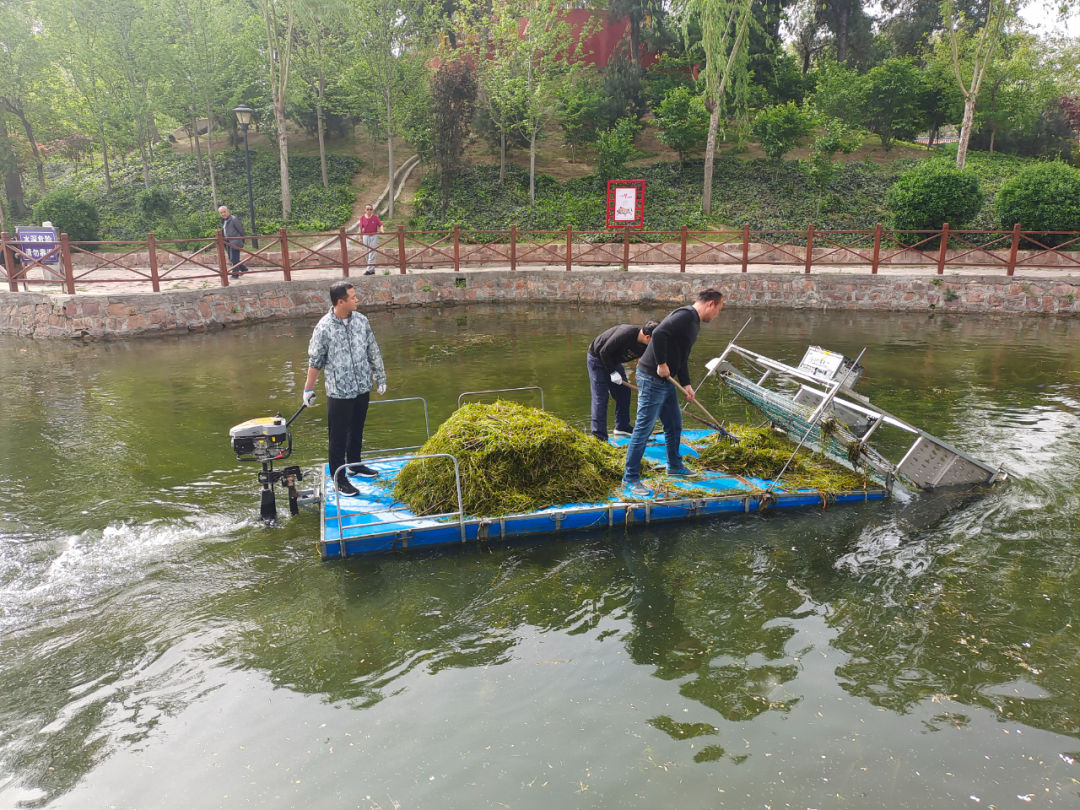 市園林中心人民公園人工湖占地近20畝,每年春季,隨著氣溫升高,湖面水草進入瘋長期,若清理不及時,既影響了湖面的美觀,又容易產生異味,對水質帶來巨大的危害。為此,人民公園迅速行動,采取有力措施開展水草清理工作,為公園湖水“美顏”。