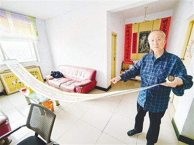 薛泮郎老人向記者展示《中國歷史長卷》。
