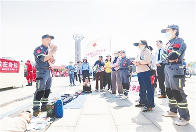市紅十字急救俠應急救援隊隊員向市民講解急救知識。
