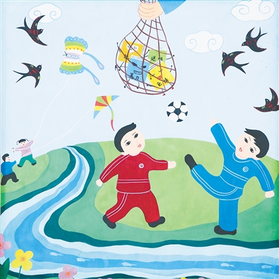 (記者 尹曉玉)藍天白云下,幾名孩子在歡樂地踢足球、放風箏,畫面和諧美好。在孩子們的頭頂,一雙大手將色情、迷信、暴力書籍收入網中……這是舞陽農民畫家梁素平的“護苗”主題作品《收網》。近日,44幅以“護苗”為主題的舞陽農民畫,在中宣部辦公區一樓大廳展出。這些作品色彩艷麗、寓意深刻,既有鮮明的時代特點和豐富的文化內涵,又使“掃黃打非”宣傳工作有了更生動、更接地氣的表達。