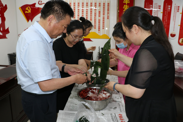 最后,大家一起體驗(yàn)了“包粽子”這一傳統(tǒng)習(xí)俗。裹粽葉、放糯米、塞紅棗、放花生、捆粽葉,各具特色的端午粽在干部職工的歡聲笑語(yǔ)中誕生。