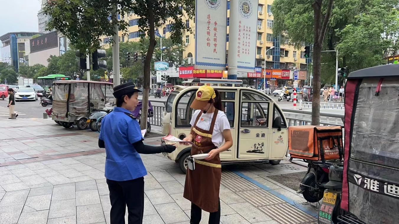 二、執(zhí)法服務(wù),兼顧并重。在認(rèn)真宣傳講解文明條例的同時(shí),中心人員積極宣傳《漯河市城市市容和環(huán)境衛(wèi)生管理?xiàng)l例》,提升知曉率。在日常工作中,始終堅(jiān)持“721”工作法,通過(guò)“服務(wù)為先”解決70%的問(wèn)題,通過(guò)“管理優(yōu)化”解決20%的問(wèn)題,通過(guò)“執(zhí)法規(guī)范”解決10%的問(wèn)題,變被動(dòng)管理為主動(dòng)服務(wù)、變末端執(zhí)法為源頭治理,對(duì)非機(jī)動(dòng)車(chē)亂停亂放現(xiàn)象,采取鎖、拖、教、罰方式;對(duì)店外經(jīng)營(yíng)、占道經(jīng)營(yíng)等問(wèn)題,以教育、勸導(dǎo)為主,對(duì)拒不配合或?qū)覄駥曳刚撸瑘?jiān)持融合執(zhí)法,依托手持終端進(jìn)行現(xiàn)場(chǎng)處罰。