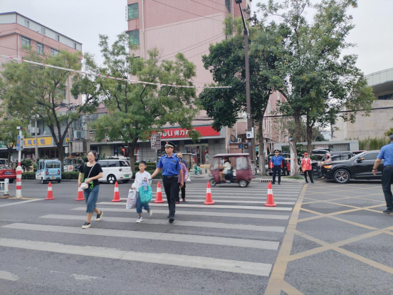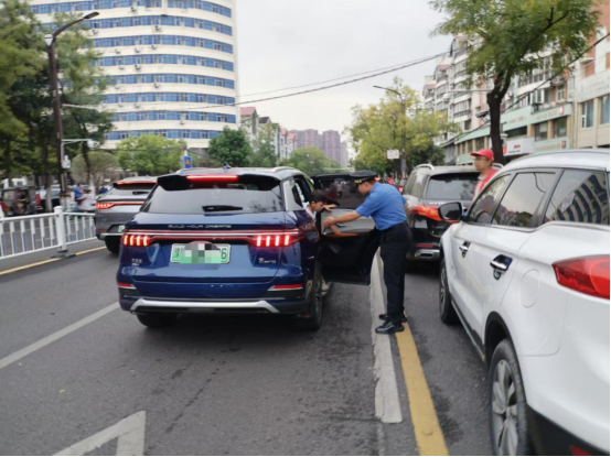 配合學校營造暢通有序、健康文明的校園周邊環境。各網格城市管理人員幫助學生家長提供開車門、搬運行李、護送學生過馬路等暖心服務。在做好護航入校的同時,并做好中午、晚間