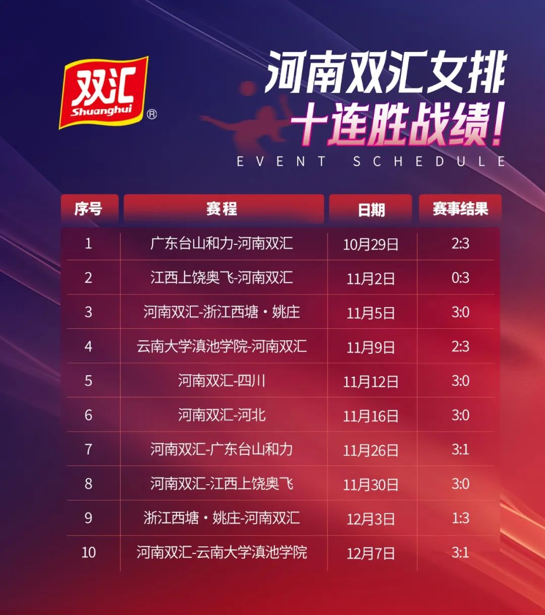國民品牌雙匯助力河南女排十連勝