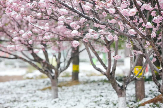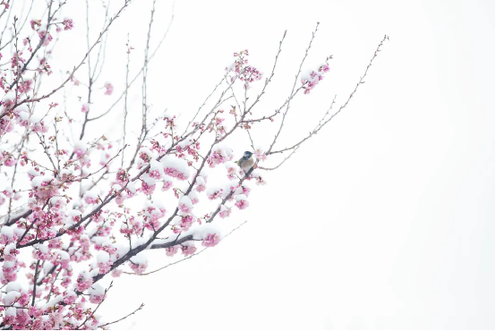 粉櫻臥雪夢春歸,靜待暖陽綻芳菲。李鑫燕 攝