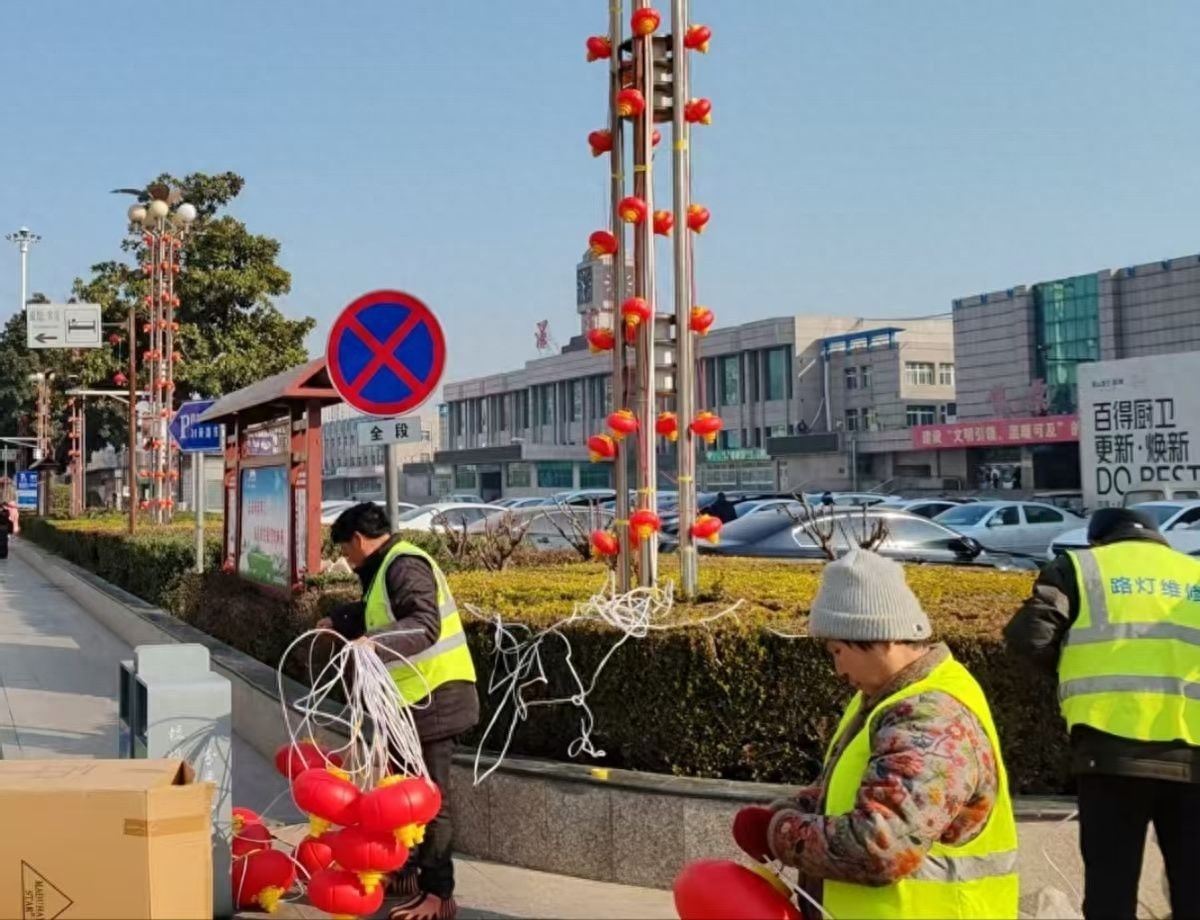 2025年1月20日下午,在河南省漯河市區(qū)火車站廣場(chǎng),工作人員正在路邊忙碌,他們認(rèn)真串接燈籠,有序懸掛裝飾,相互協(xié)作,高效推進(jìn)市區(qū)迎春燈飾安裝工作,全力扮靚城市名片。