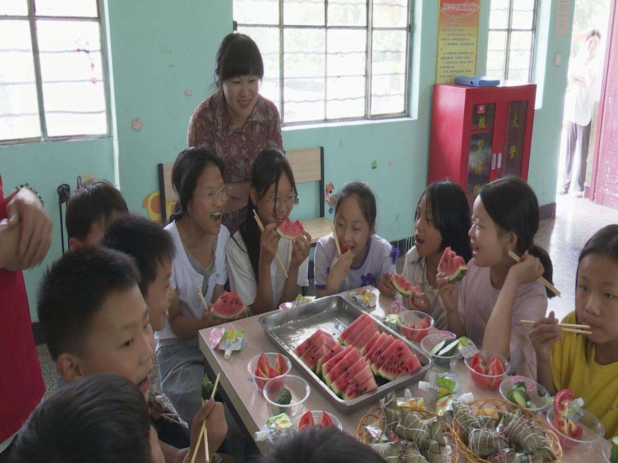 在三家店鎮高宗寨村兒童之家,鎮村干部們一早便忙活開來。他們精心準備了粽子、果凍,將鎮內特色農產品西紅柿、黃瓜、西瓜洗凈切片,撒上白糖,制成飽含愛意的美食。活動現場,孩子們圍坐在一起,伴隨著稚嫩的童聲合唱《小星星》,品嘗著酸甜可口的西紅柿、清爽多汁的果蔬拼盤和軟糯香甜的粽子,歡聲笑語此起彼伏。"太好吃啦!紅紅的西紅柿、圓圓的大西瓜、脆脆的黃瓜,還有甜甜的粽子,比我以前吃過的都好吃!我太喜歡了",高宗寨小學學生宋夢凡開心地分享著感受。鎮村干部們一邊與孩子們品嘗美食,一邊親切詢問學習生活情況,用實際行動傳遞溫暖關懷。