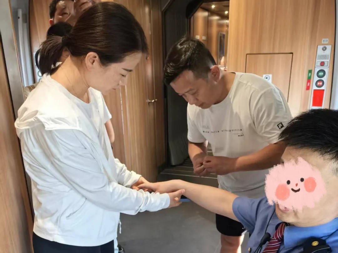 抵達現場,他們發現一名身著列車員制服的男性工作人員面色慘白、冷汗淋漓,因腰部劇痛蜷縮并呻吟。憑借豐富經驗,兩人判斷其可能是腎結石引發的腎絞痛。在列車工作人員協助下,潘建濤施展中醫針灸,李璐同步監測生命體征、安撫患者。經救治,患者疼痛明顯減輕。他們向列車方交代后續注意事項后默默返回座位。