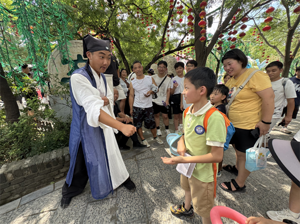 一踏入萬歲山武俠城,古色古香的宋代街巷和建筑便映入孩子們眼簾,仿佛穿越回了千年前的大宋。街道上,鄭記肉鋪、獅子樓、王婆茶莊等實景店鋪,充滿生活氣息,孩子們好奇地打量著,想象著古人的生活場景。街邊藝人的精彩表演引得孩子們陣陣驚嘆,歡呼聲此起彼伏。《三打祝家莊》里,逼真的城墻、城門、大炮和烽火臺,激烈的戰斗場面配合影視爆破、云梯炮戰、大型馬術等實景拍攝技術,將《水滸傳》中的情節鮮活呈現,孩子們看得目不轉睛,被綠林好漢們的江湖豪情深深吸引,演出結束后,掌聲雷動。在萬歲山武俠城內,孩子們還觀賞了多場精彩絕倫的演出。從《吊環》的驚險特技到《大宋奇兵》的英勇無畏,再到《李逵斷案》和《林沖戰楊志》……此外,孩子們還進行了一系列互動體驗活動。通過石頭剪刀布、投壺等游戲來賺取銀票,換取自己喜歡的物品。每一場演出都讓孩子們陶醉其中,流連忘返。