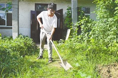 8月25日下午,記者走進舞陽縣孟寨鎮龍東村王帥斌的家中。院內有一條通向堂屋的碎磚路,其他地方種了些蔬菜,剩余地方都是荒草。三間房屋經過危房改造,房頂加固了彩鋼瓦。18歲的王帥斌正手握鐵鍬,鏟除小路上的雜草。