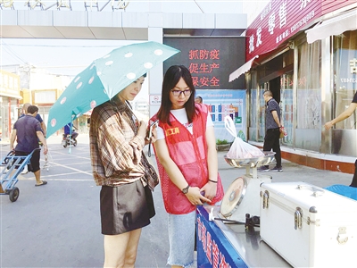 在受降路農(nóng)貿(mào)市場,網(wǎng)格員用放心秤幫市民核重。