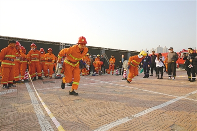 消防員技能比武競(jìng)賽。本報(bào)記者 朱 紅 攝