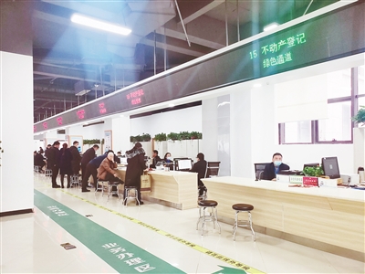 三樓大廳西南角的一個LED電子屏上,顯示著“不動產登記綠色通道”幾個字。