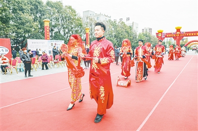 當天上午10時許,在婚禮現場,端莊秀麗的新娘們等待著意中人;新郎們瀟灑大方,期待抱得美人歸。吉時已到,中式婚禮開始,先是傳統的大鼓、舞獅表演,接著是新娘入場、新婿登場,然后是迎新娘、入華堂、拜天地、交換定情信物、夫妻對拜、合影等活動流程。