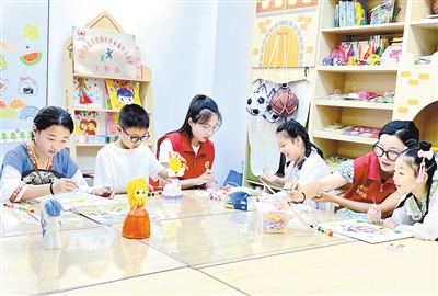 西城區月灣湖社區青少年活動室里,志愿者在教孩子們做手工。記者 齊國霞 攝