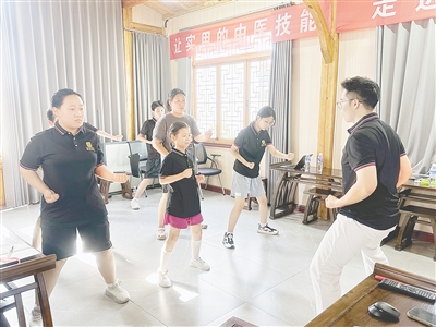 目前正值暑假,知育學堂內的青少年中醫夏令營活動正在進行中。記者在夏令營的活動教室看到,十幾個孩子跟著老師練習八段錦。參加夏令營的孩子們來自天津、河北、鄭州等。“我媽媽從河北開車把我送到這里,主要是為了培養我對中醫的興趣,讓我了解如何調理自己的身體。”今年12歲的陳榮告訴記者。