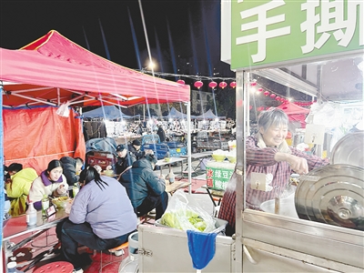 最吸引消費者的當屬熱乎乎的麻辣面攤位。攤位旁邊的小桌子座無虛席,還有不少顧客選擇打包帶走。“這幾天溫度比較低,但是來吃手撕面的顧客仍然不少。一般傍晚六七點會迎來一波就餐高峰。有時候晚上11點還有人來這里吃上一碗面。我們通常營業到深夜12點。忙起來確實辛苦,但是和家人一起做生意的日子也很幸福。”經營麻辣面攤位的黨阿姨告訴記者。