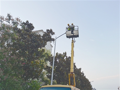 市城管局路燈維護中心工作人員在維修路燈。