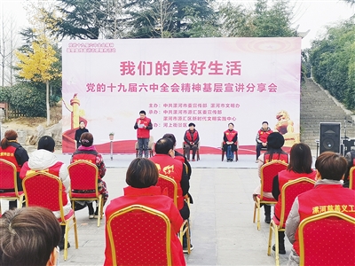 (記者 朱 紅)12月10日,由市委宣傳部、市文明辦主辦,源匯區委宣傳部、源匯區新時代文明實踐中心承辦的黨的十九屆六中全會精神基層宣講分享會在河上街景區開講,邀請“全國五一勞動獎章”獲得者、際華三五一五皮革皮鞋有限公司首席工匠、工程師陳虎,志愿團隊代表、媽媽團公益團隊負責人武艷麗,馬路街街道建設路社區主任林霞,非物質文化遺產傳承人、漯河職業技術學院教師陳明杰四位嘉賓,圍繞黨的十九屆六中全會精神、結合自己的工作實際和學習感悟,為大家帶來了一場接地氣的主題宣講。
