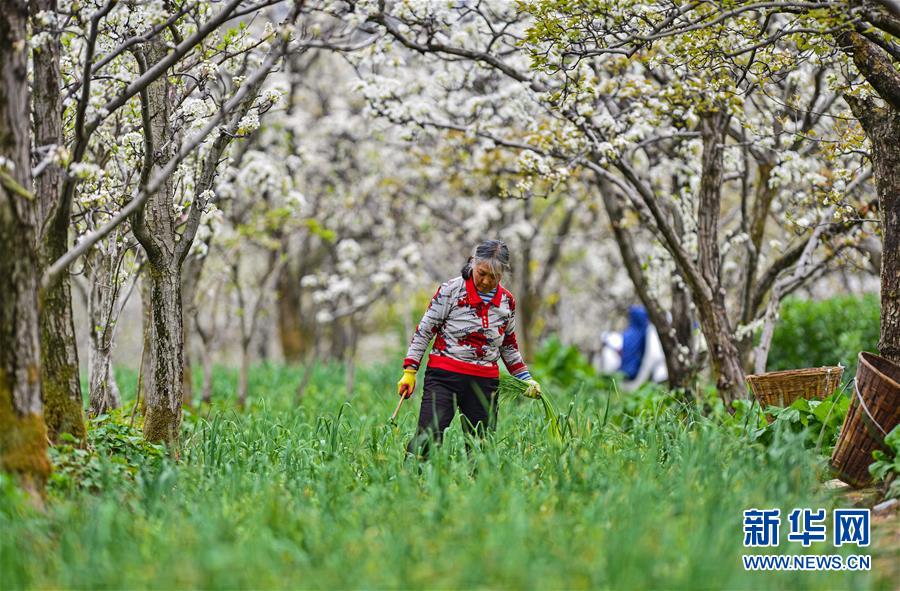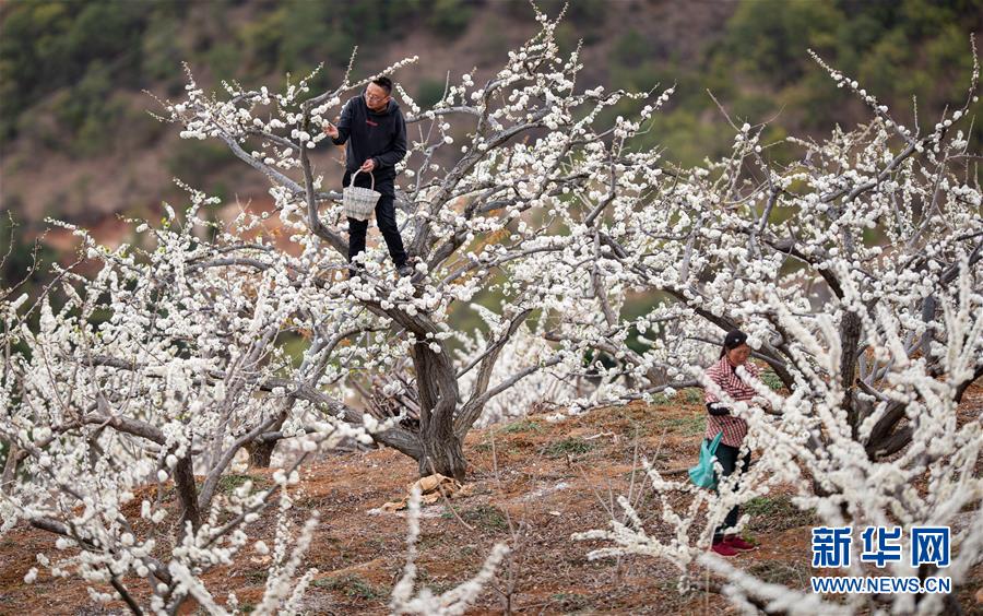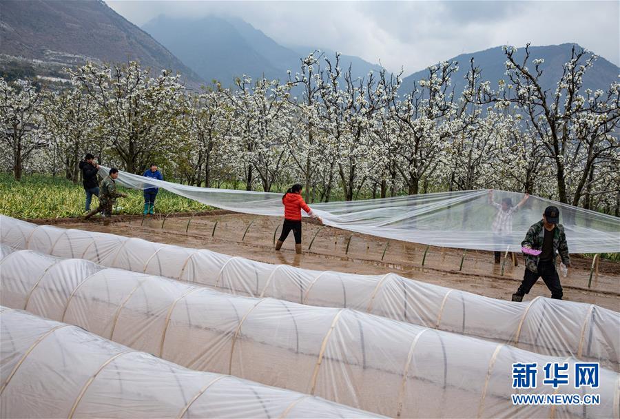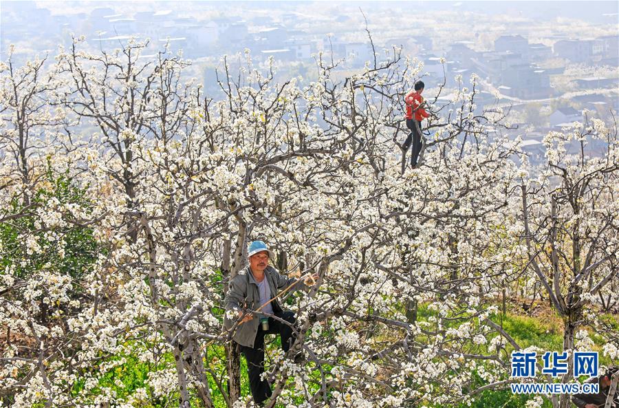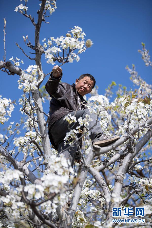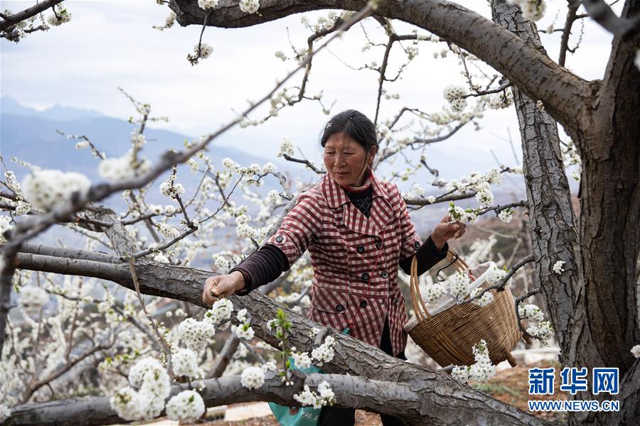 3月19日,漢源縣九襄鎮新堰村村民對梨花人工授粉。 隨著氣溫回升和春雨到來,四川省漢源縣九襄鎮等地的村民投入到疏花、人工授粉、育苗等農業勞動中。 新華社記者 江宏景 攝
