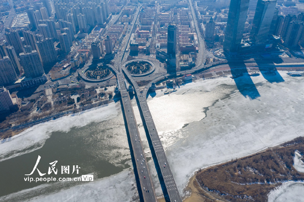 2020年3月22日,松花江哈爾濱段江面隨著氣溫升高正逐漸融化,形成“半江春水,半江寒冰”的自然現象。王昭博/人民圖片