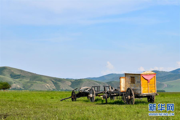 烏蘭毛都草原上的勒勒車(7月1日攝)。 盛夏時節,內蒙古興安盟科爾沁右翼前旗的烏蘭毛都草原綠意盎然,風景醉人。 烏蘭毛都草原地處大興安嶺南麓,屬丘陵山地草原,風光獨特。 新華社記者 貝赫 攝