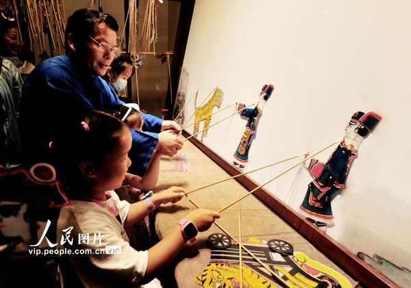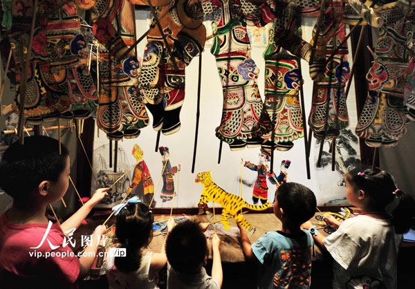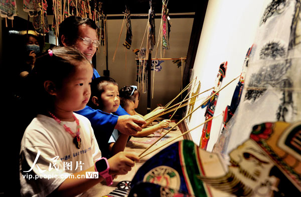 2020年7月25日,上海市松江區泗涇老街的皮影館當天上演傳統古裝皮影戲《武松打虎》,吸引一些孩子們前來觀看。演出結束后,孩子們還在后臺親手體驗操作皮影人物。楊建正/人民圖片