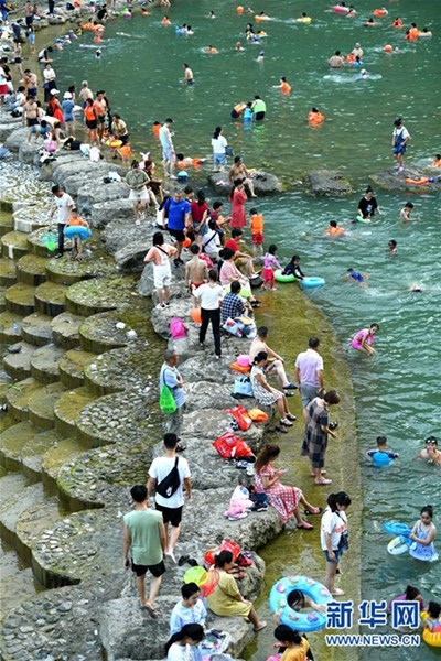 8月5日傍晚,人們?cè)诤笔⌒骺h城貢水河游泳區(qū)內(nèi)游泳消暑。 湖北省恩施土家族苗族自治州宣恩縣在穿城而過(guò)的貢水河兩岸設(shè)立了親水步道、游泳戲水、劃船健身、休閑納涼等區(qū)域,并建設(shè)更衣室、休閑座椅、公共直飲水等基礎(chǔ)設(shè)施,方便人們共享貢水河帶來(lái)的夏日清涼。 新華社發(fā)(宋文 攝)