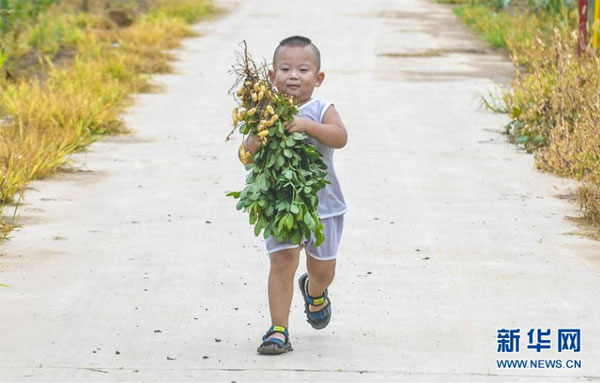 8月6日,小朋友在河北省永清縣后奕鎮一處休閑樂園里運送采摘的花生。 近年來,河北省永清縣采取“農業+文化+旅游”方式,整合農業、人文、生態等資源優勢,通過召開旅發大會等形式,打造休閑游、采摘游、親子游等特色旅游活動,積極推動鄉村旅游發展,促進當地群眾就業增收,助力鄉村振興。 新華社記者 李曉果 攝